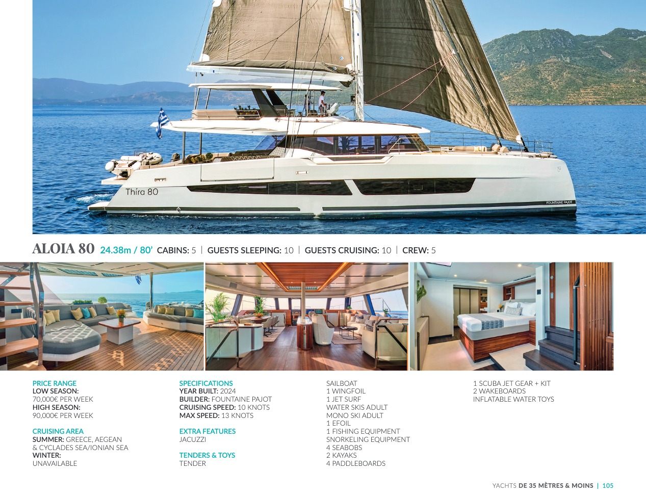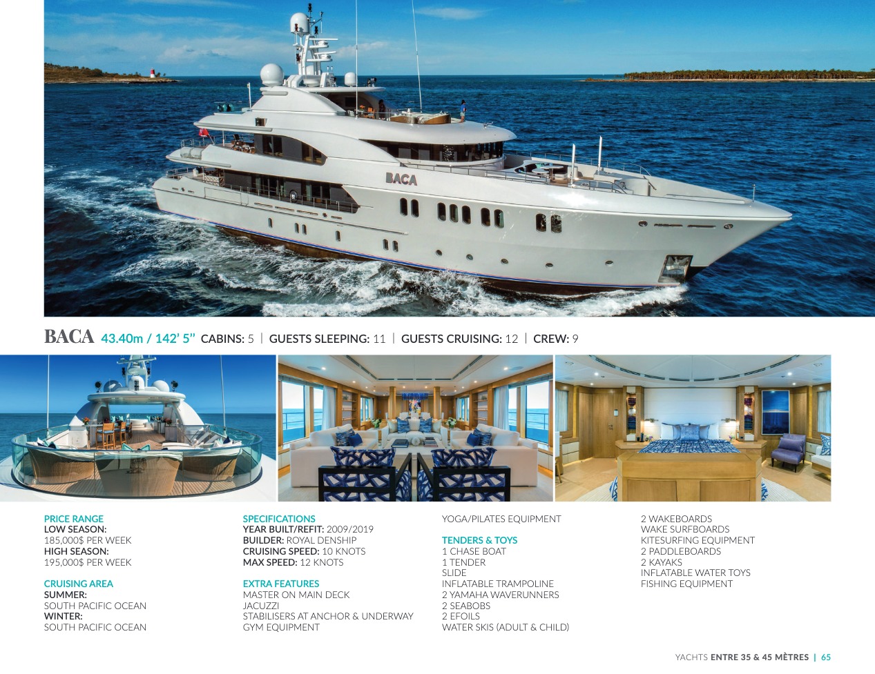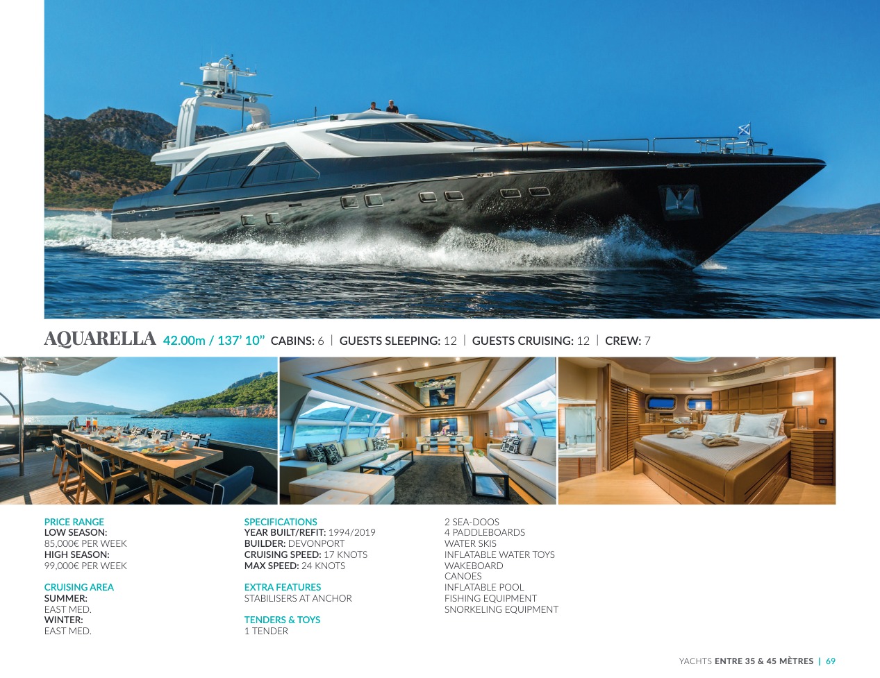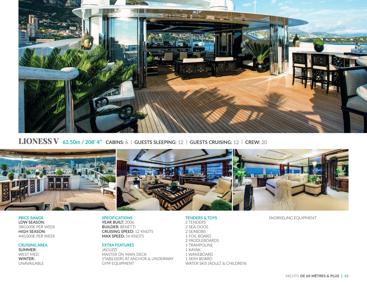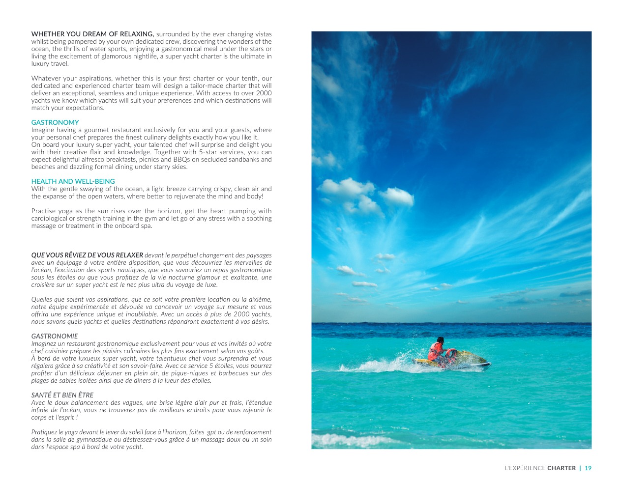 What sets the luxury yacht apart is the exceptional character of the services and the heavenly sense of well-being it offers. With a search for quality, innovation and aesthetics found in every detail, you will have an extraordinary experience, whether you have chosen it for pleasure cruises or to enjoy it your way all year round. Design, technology, navigation power, layout and top-of-the-range interior decoration transform these boats into floating paradises that sail on the waters of the whole planet. The luxury yacht can be an elegant sail boat based in the Mediterranean such as Rosehearty, a catamaran like Hémisphère criss-crossing the South Pacific or a superyacht like Bella Vita from the Benetti shipyard. Spending time on this yacht is an unforgettable adventure, rich in immense comfort, with a swimming pool, a spa, a sauna, luxury suites, and a reception room.