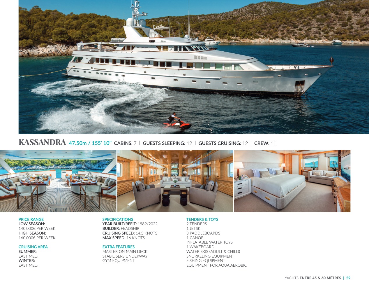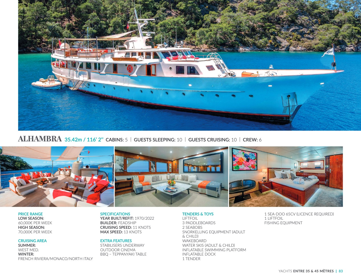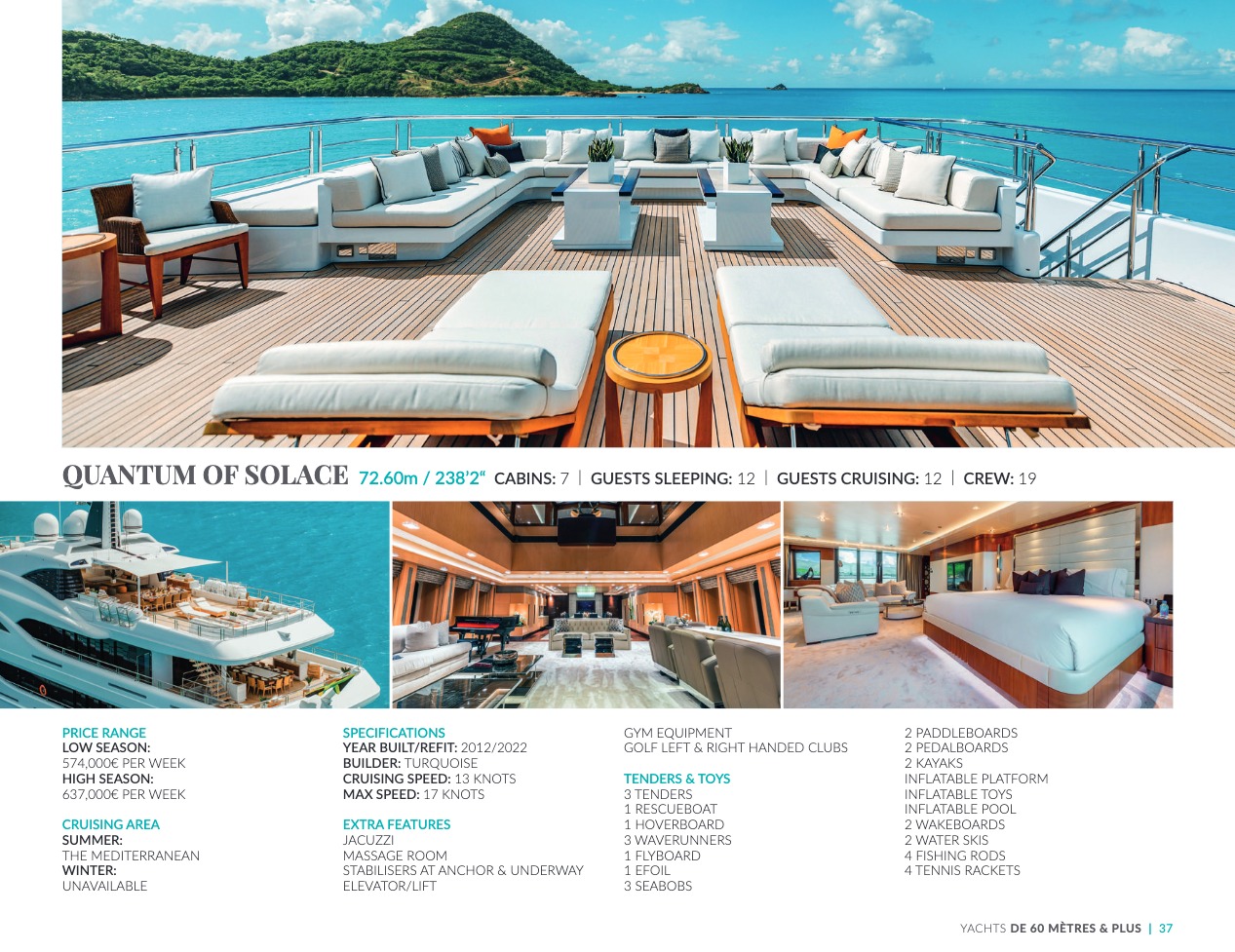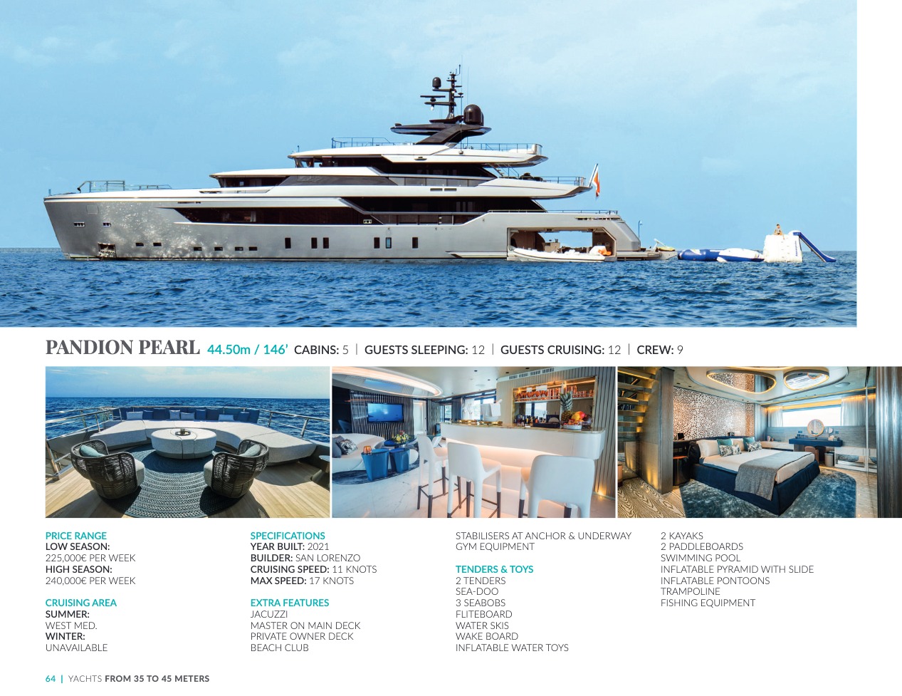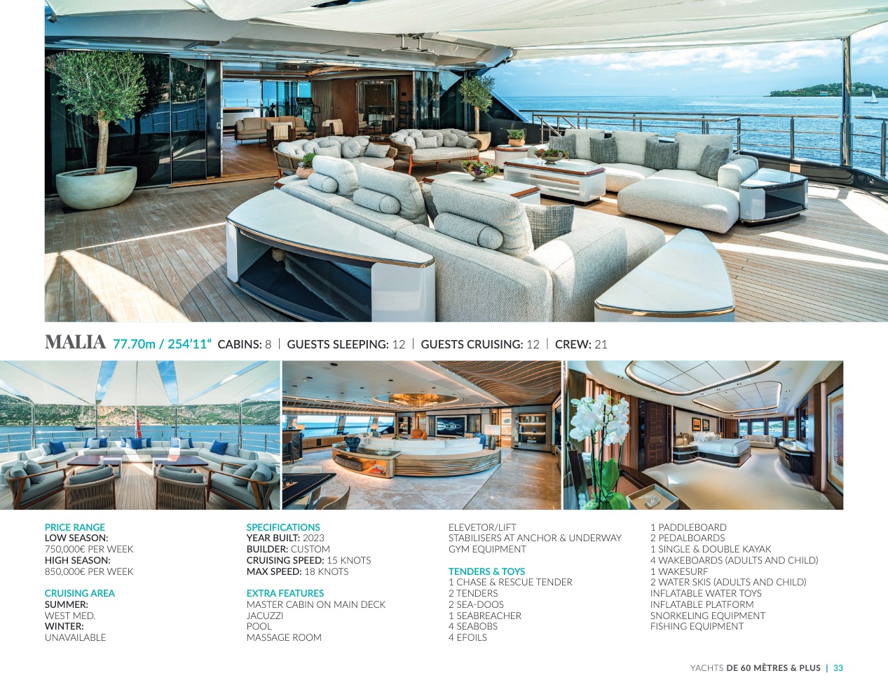 What sets the luxury yacht apart is the exceptional character of the services and the heavenly sense of well-being it offers. With a search for quality, innovation and aesthetics found in every detail, you will have an extraordinary experience, whether you have chosen it for pleasure cruises or to enjoy it your way all year round. Design, technology, navigation power, layout and top-of-the-range interior decoration transform these boats into floating paradises that sail on the waters of the whole planet. The luxury yacht can be an elegant sail boat based in the Mediterranean such as Rosehearty, a catamaran like Hémisphère criss-crossing the South Pacific or a superyacht like Bella Vita from the Benetti shipyard. Spending time on this yacht is an unforgettable adventure, rich in immense comfort, with a swimming pool, a spa, a sauna, luxury suites, and a reception room.