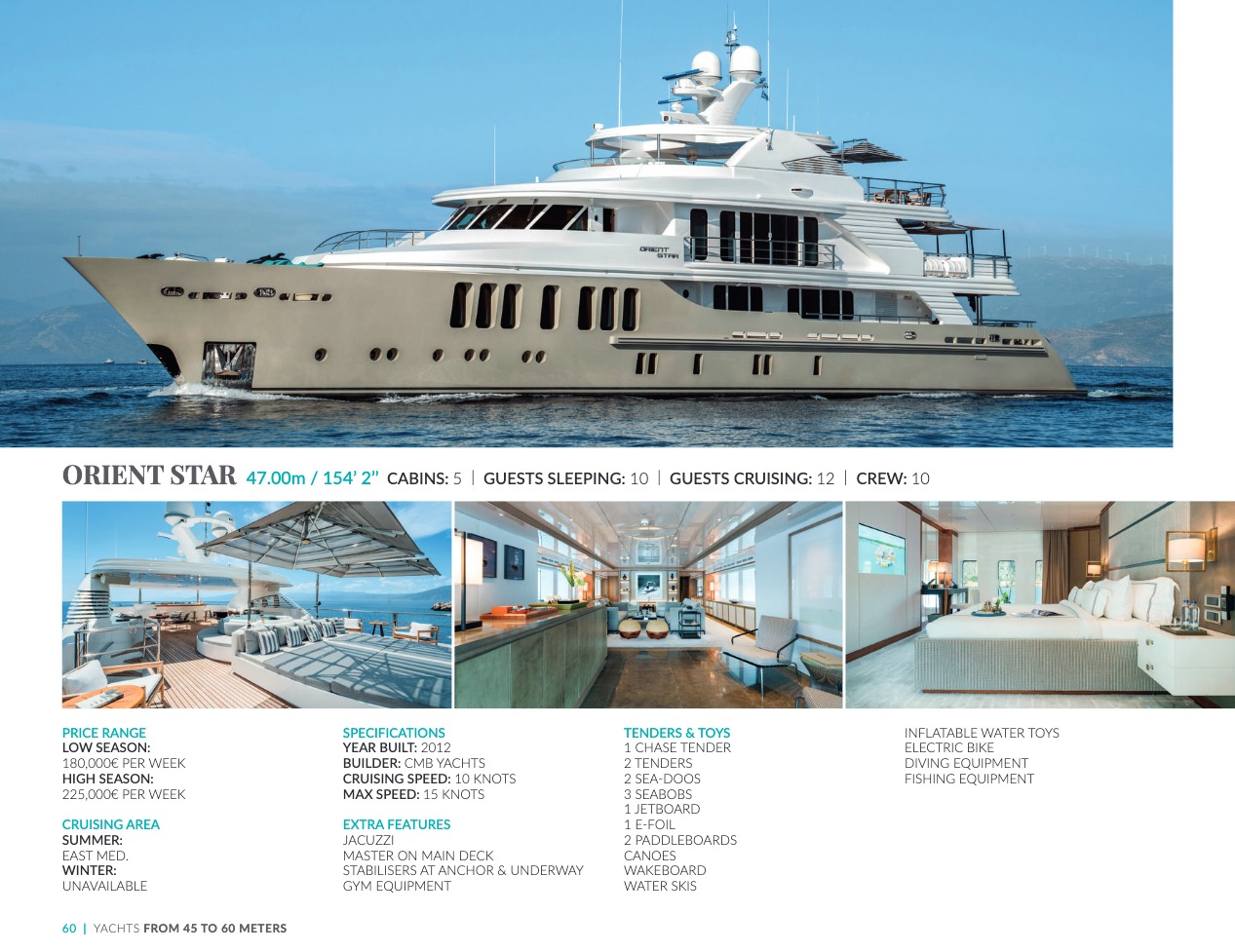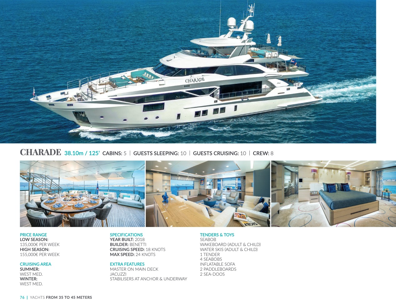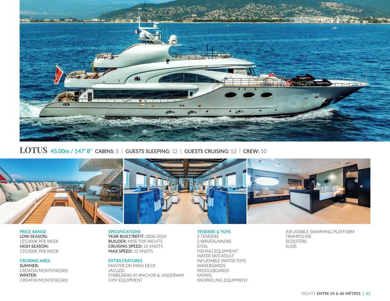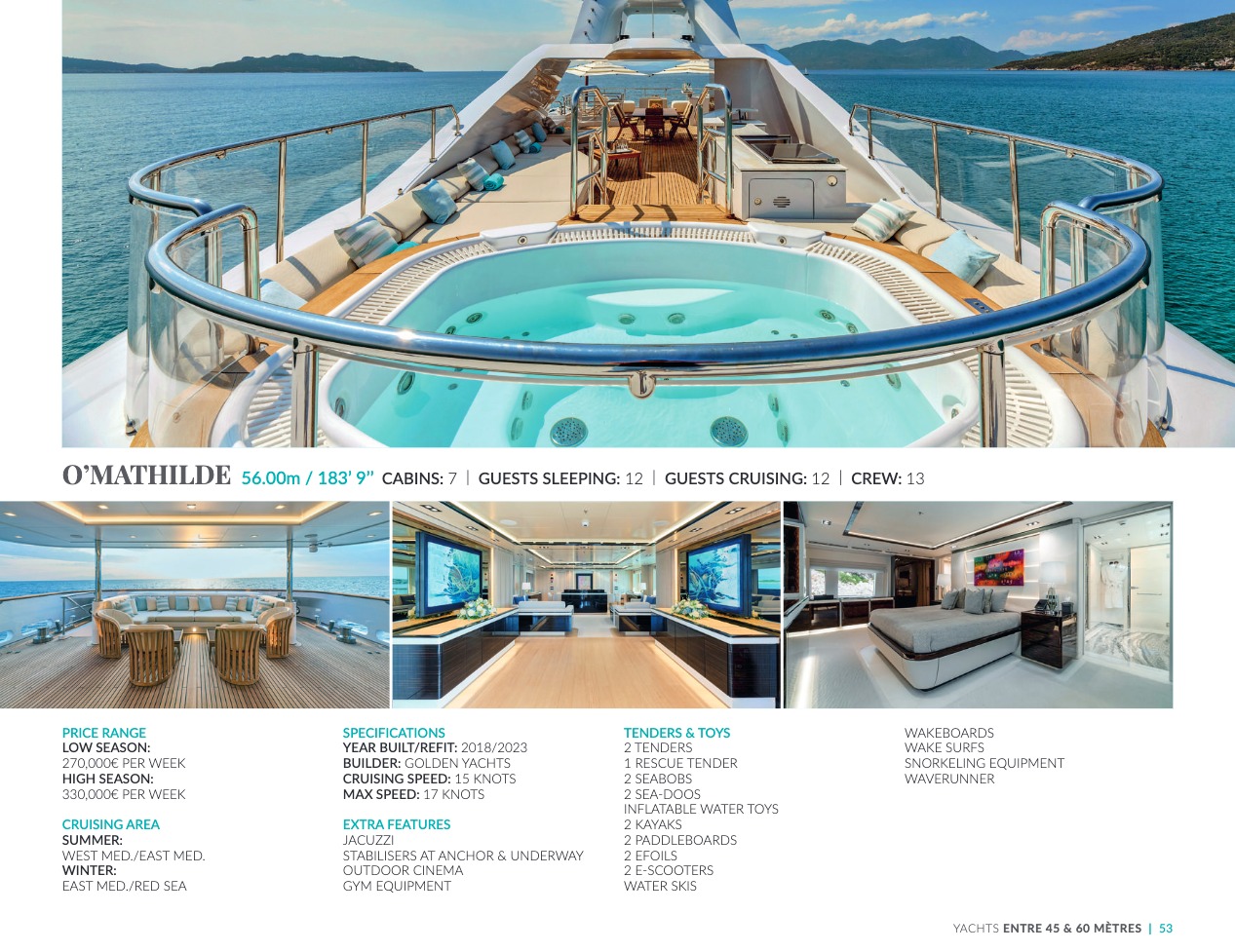 What sets the luxury yacht apart is the exceptional character of the services and the heavenly sense of well-being it offers. With a search for quality, innovation and aesthetics found in every detail, you will have an extraordinary experience, whether you have chosen it for pleasure cruises or to enjoy it your way all year round. Design, technology, navigation power, layout and top-of-the-range interior decoration transform these boats into floating paradises that sail on the waters of the whole planet. The luxury yacht can be an elegant sail boat based in the Mediterranean such as Rosehearty, a catamaran like Hémisphère criss-crossing the South Pacific or a superyacht like Bella Vita from the Benetti shipyard. Spending time on this yacht is an unforgettable adventure, rich in immense comfort, with a swimming pool, a spa, a sauna, luxury suites, and a reception room.