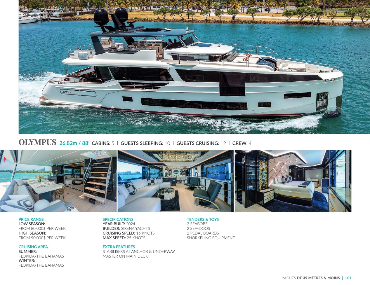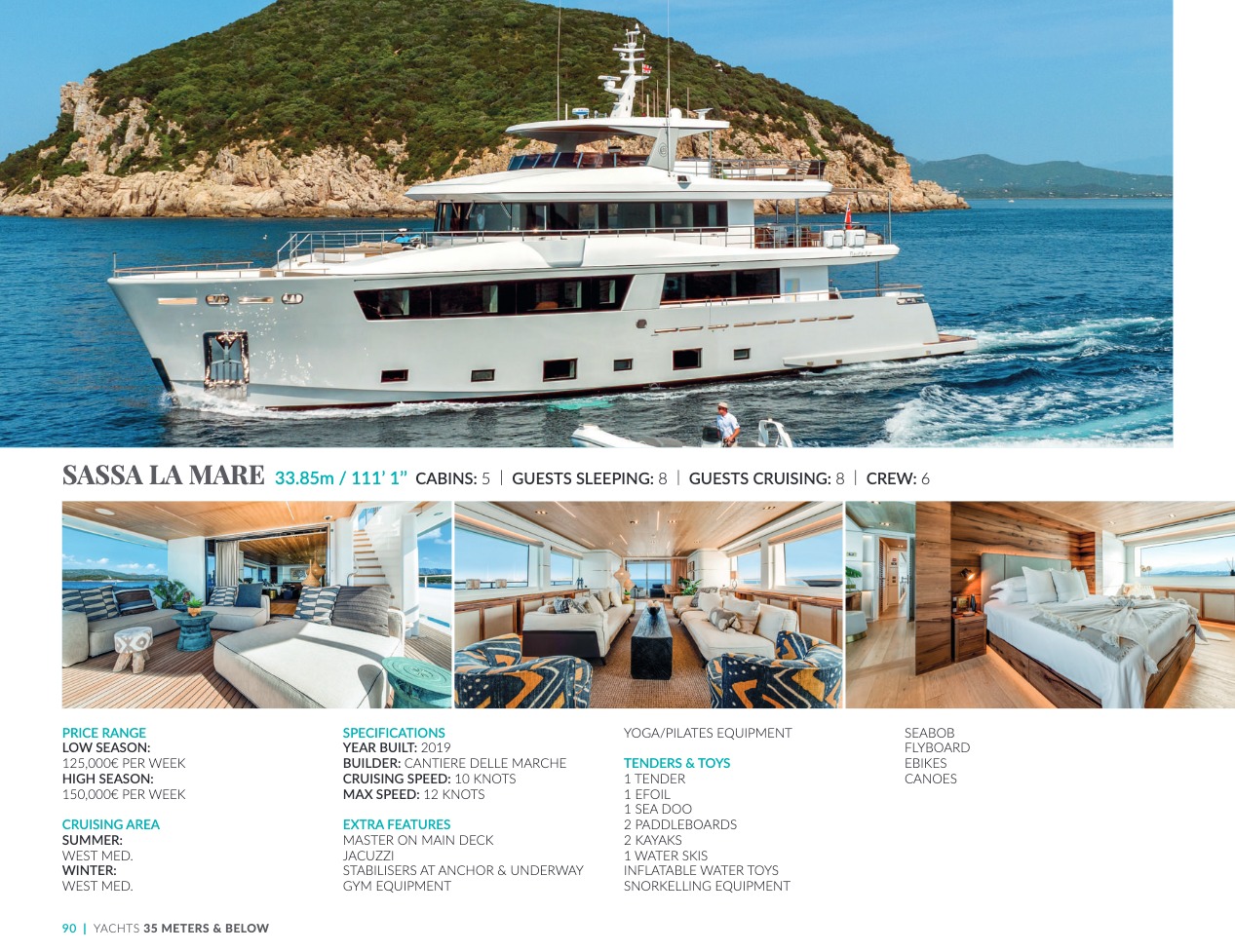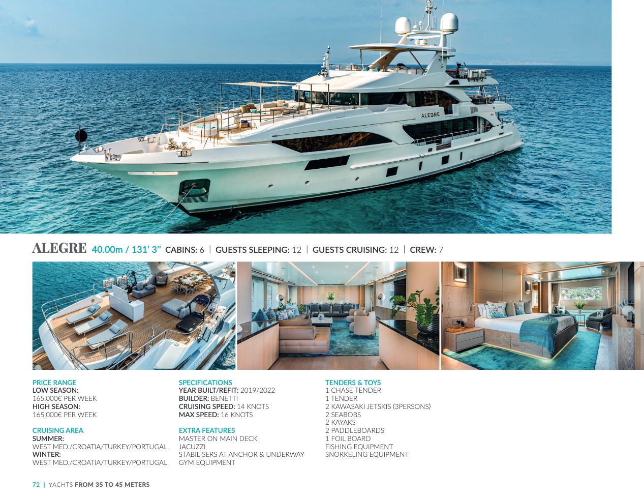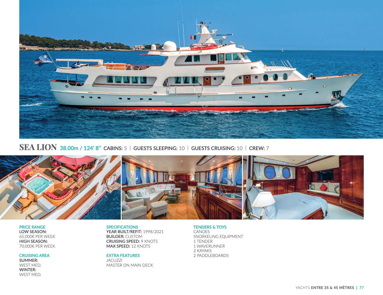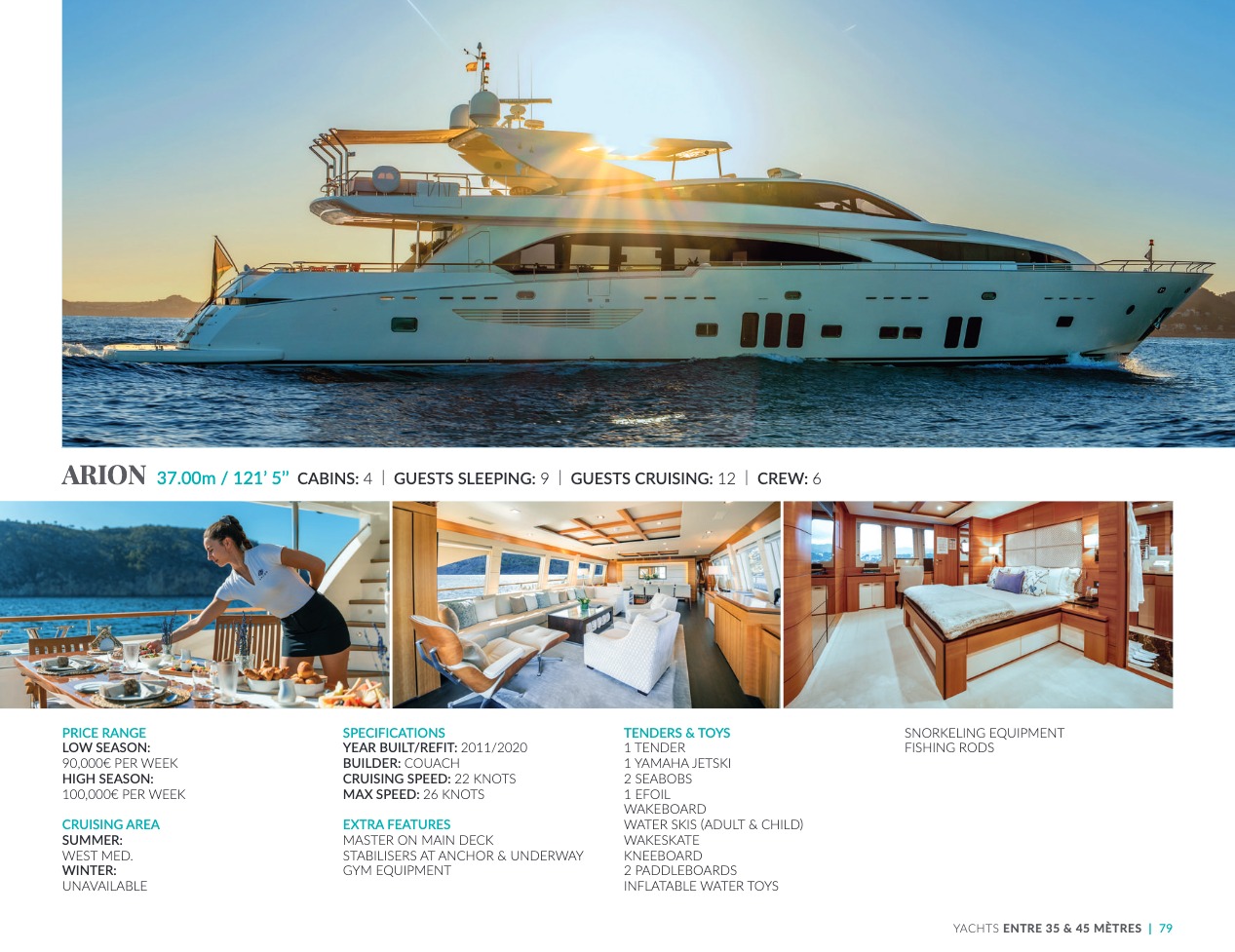 What sets the luxury yacht apart is the exceptional character of the services and the heavenly sense of well-being it offers. With a search for quality, innovation and aesthetics found in every detail, you will have an extraordinary experience, whether you have chosen it for pleasure cruises or to enjoy it your way all year round. Design, technology, navigation power, layout and top-of-the-range interior decoration transform these boats into floating paradises that sail on the waters of the whole planet. The luxury yacht can be an elegant sail boat based in the Mediterranean such as Rosehearty, a catamaran like Hémisphère criss-crossing the South Pacific or a superyacht like Bella Vita from the Benetti shipyard. Spending time on this yacht is an unforgettable adventure, rich in immense comfort, with a swimming pool, a spa, a sauna, luxury suites, and a reception room.