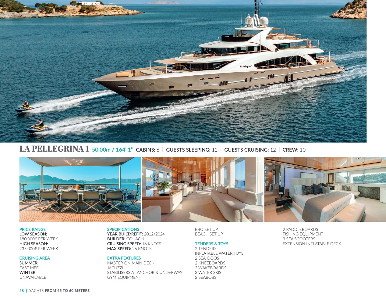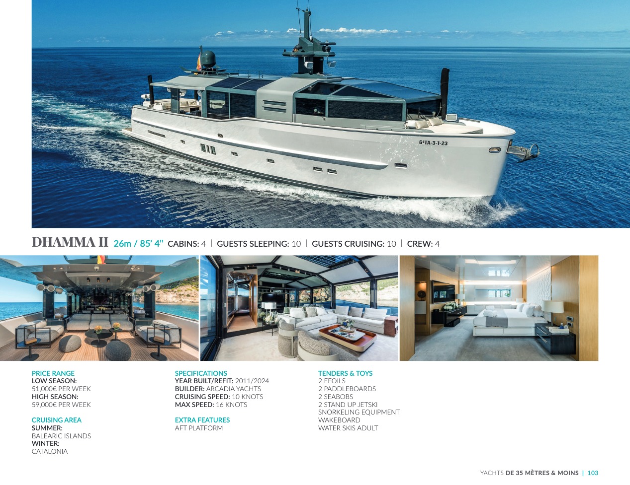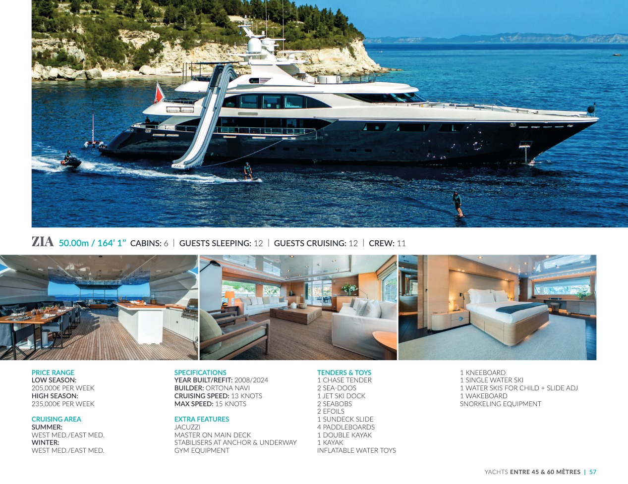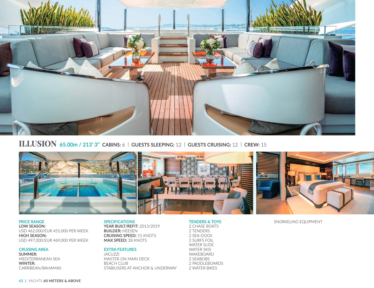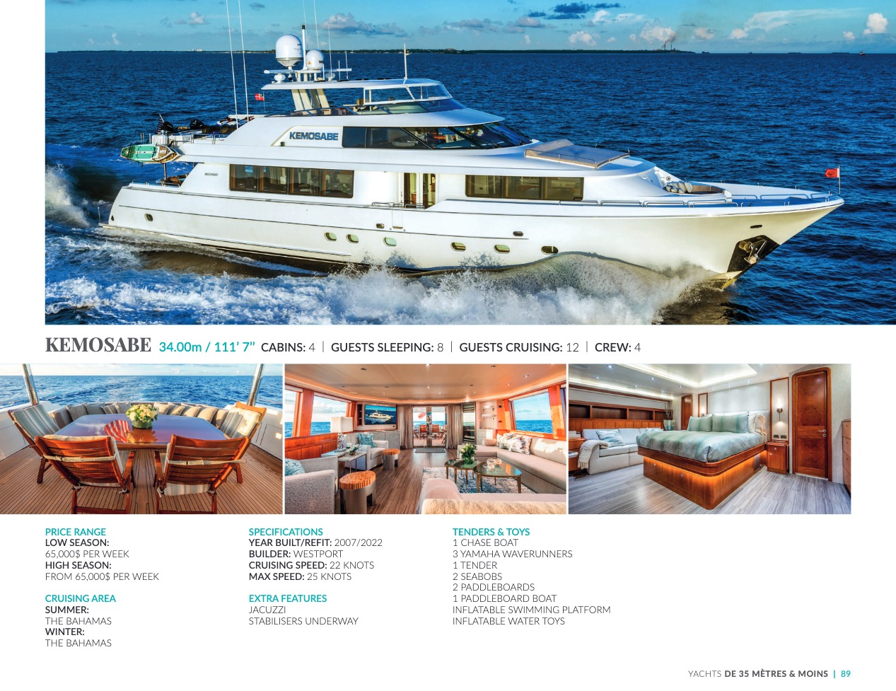 What sets the luxury yacht apart is the exceptional character of the services and the heavenly sense of well-being it offers. With a search for quality, innovation and aesthetics found in every detail, you will have an extraordinary experience, whether you have chosen it for pleasure cruises or to enjoy it your way all year round. Design, technology, navigation power, layout and top-of-the-range interior decoration transform these boats into floating paradises that sail on the waters of the whole planet. The luxury yacht can be an elegant sail boat based in the Mediterranean such as Rosehearty, a catamaran like Hémisphère criss-crossing the South Pacific or a superyacht like Bella Vita from the Benetti shipyard. Spending time on this yacht is an unforgettable adventure, rich in immense comfort, with a swimming pool, a spa, a sauna, luxury suites, and a reception room.