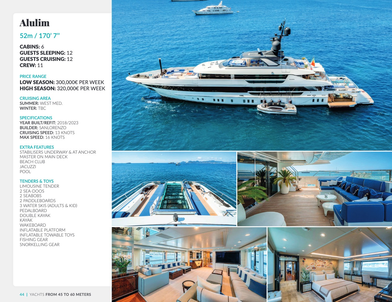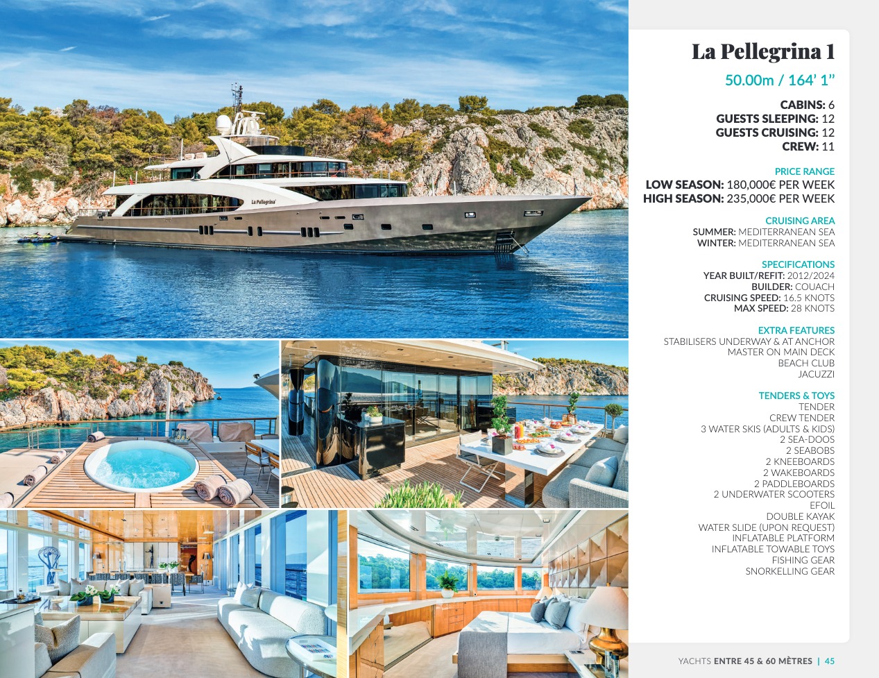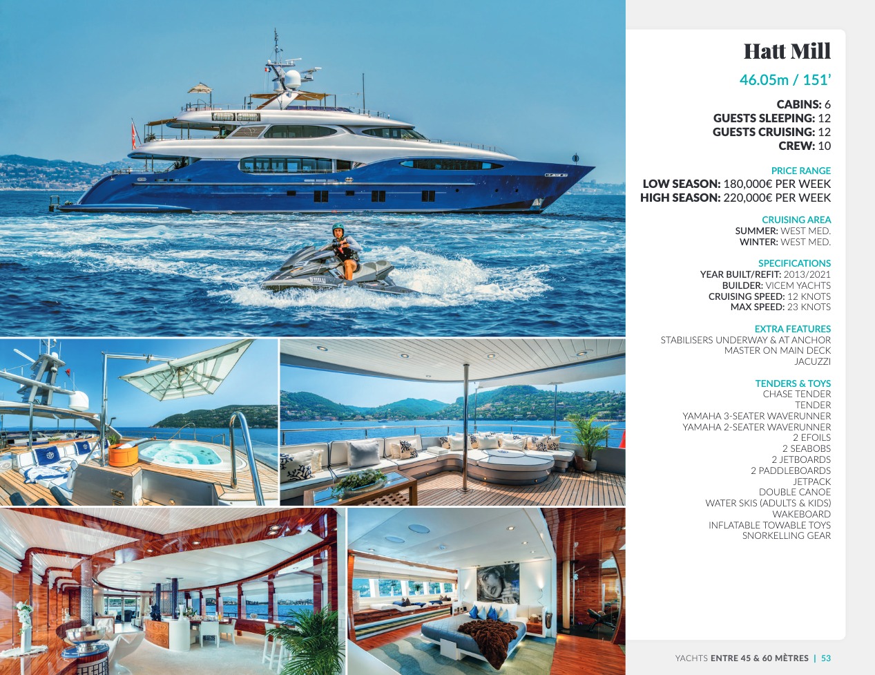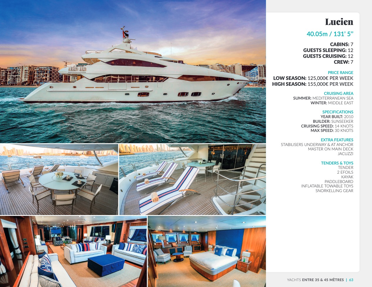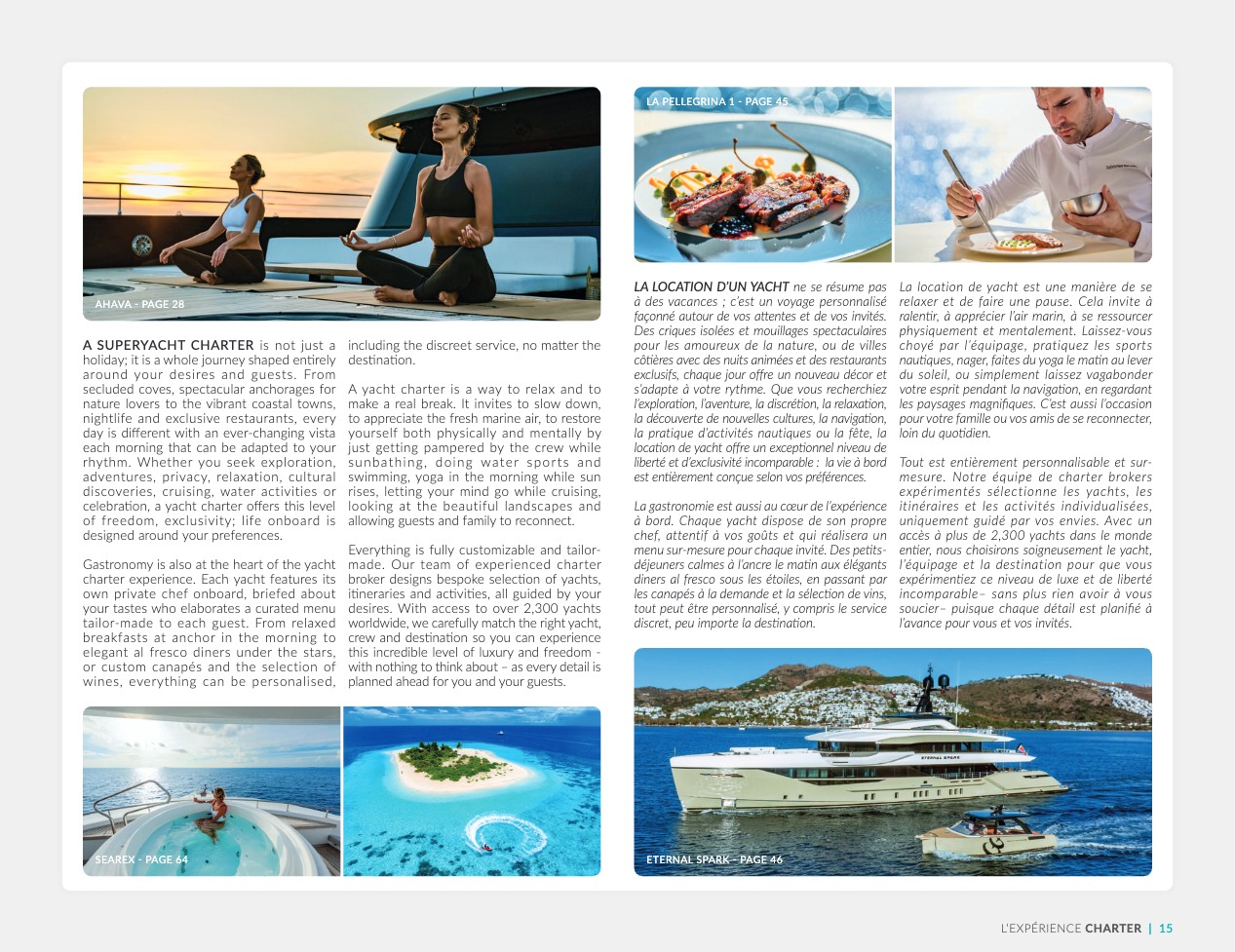 Ce qui distingue le yacht de luxe entre tous est le caractère d’exception des prestations et du bien-être paradisiaque qu’il offre. Avec une recherche de qualité, d’innovation et d’esthétique qui se retrouvent dans chaque détail, vous bénéficierez d’une expérience hors du commun, et ce, que vous ayez choisi pour des séjours de courte durée, ou pour en profiter à votre guise toute l’année. Design, technologie, puissance de navigation, agencement et décoration intérieur haut de gamme transforment ces navires en paradis voguant sur les eaux de toute la planète. Le yacht de luxe peut être un élégant voilier basé en Méditerranée tel que Rosehearty, un catamaran comme Hémisphère sillonnant le pacifique Sud ou un superyacht à l’image de Bella Vita du chantier Benetti. Le séjour s’y présente en aventure inoubliable, riche d’un confort immense, avec piscine, spa, sauna, suites de luxe, salle de réception.