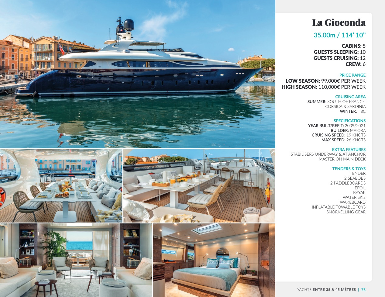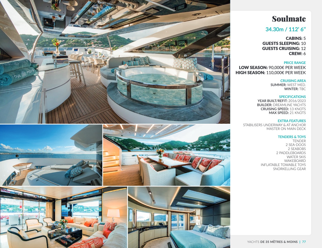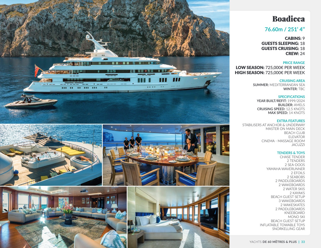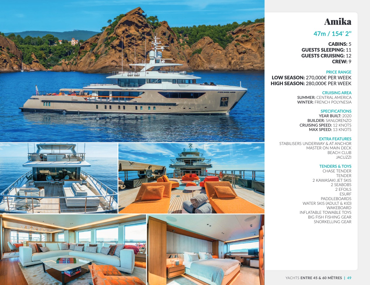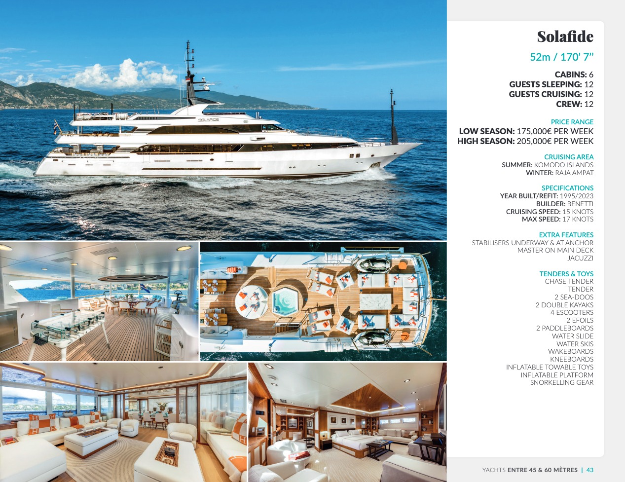 Ce qui distingue le yacht de luxe entre tous est le caractère d’exception des prestations et du bien-être paradisiaque qu’il offre. Avec une recherche de qualité, d’innovation et d’esthétique qui se retrouvent dans chaque détail, vous bénéficierez d’une expérience hors du commun, et ce, que vous ayez choisi pour des séjours de courte durée, ou pour en profiter à votre guise toute l’année. Design, technologie, puissance de navigation, agencement et décoration intérieur haut de gamme transforment ces navires en paradis voguant sur les eaux de toute la planète. Le yacht de luxe peut être un élégant voilier basé en Méditerranée tel que Rosehearty, un catamaran comme Hémisphère sillonnant le pacifique Sud ou un superyacht à l’image de Bella Vita du chantier Benetti. Le séjour s’y présente en aventure inoubliable, riche d’un confort immense, avec piscine, spa, sauna, suites de luxe, salle de réception.