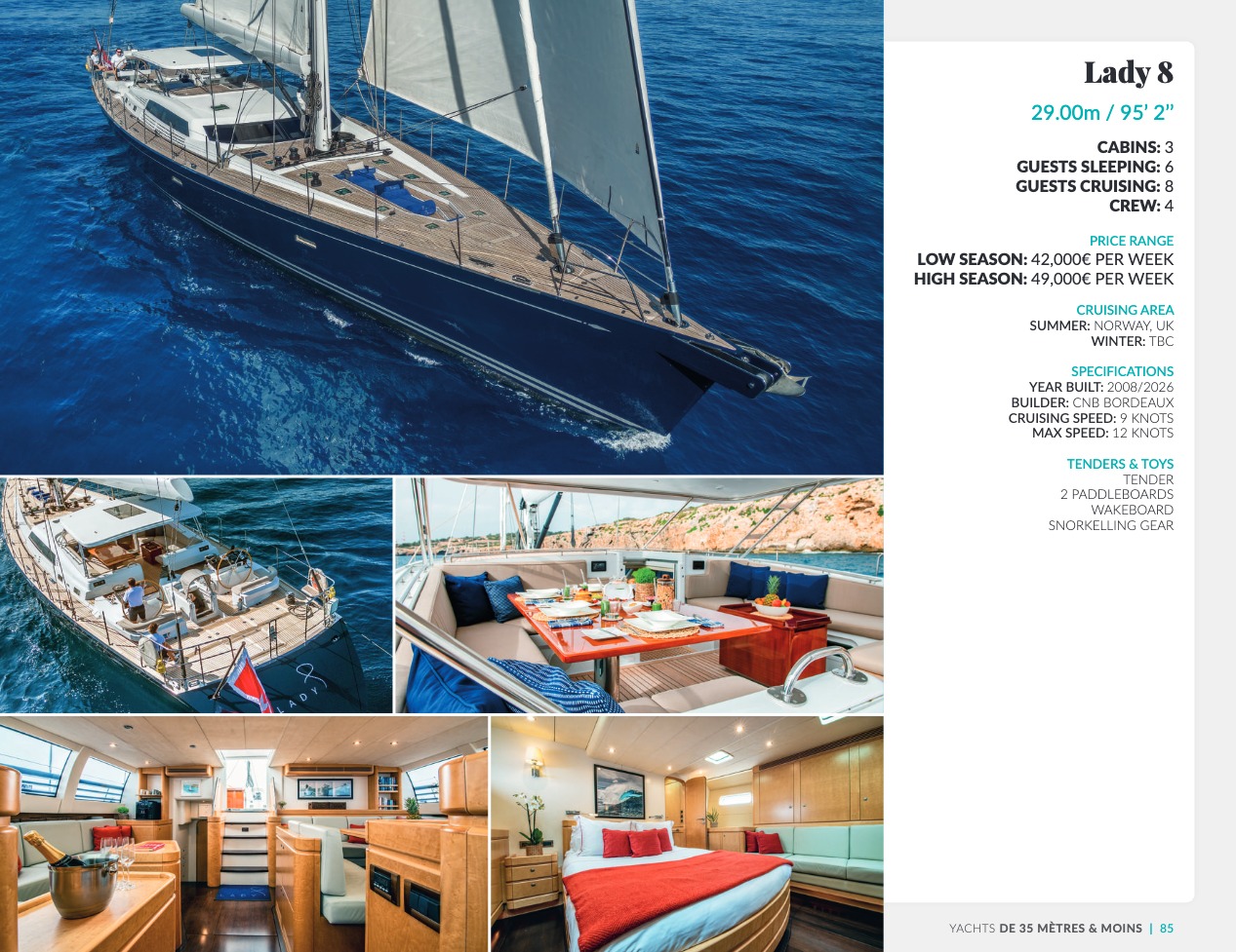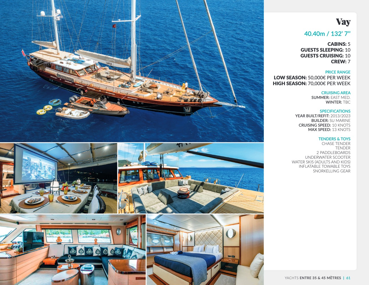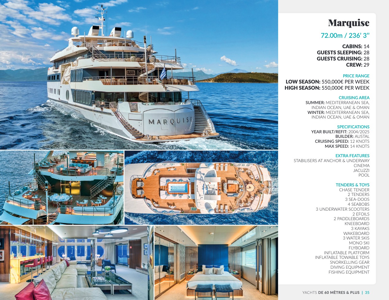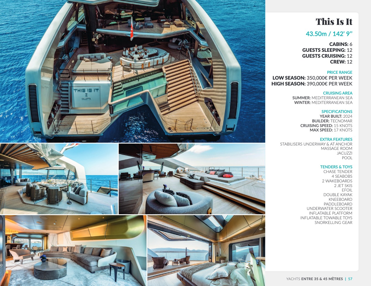 Ce qui distingue le yacht de luxe entre tous est le caractère d’exception des prestations et du bien-être paradisiaque qu’il offre. Avec une recherche de qualité, d’innovation et d’esthétique qui se retrouvent dans chaque détail, vous bénéficierez d’une expérience hors du commun, et ce, que vous ayez choisi pour des séjours de courte durée, ou pour en profiter à votre guise toute l’année. Design, technologie, puissance de navigation, agencement et décoration intérieur haut de gamme transforment ces navires en paradis voguant sur les eaux de toute la planète. Le yacht de luxe peut être un élégant voilier basé en Méditerranée tel que Rosehearty, un catamaran comme Hémisphère sillonnant le pacifique Sud ou un superyacht à l’image de Bella Vita du chantier Benetti. Le séjour s’y présente en aventure inoubliable, riche d’un confort immense, avec piscine, spa, sauna, suites de luxe, salle de réception.