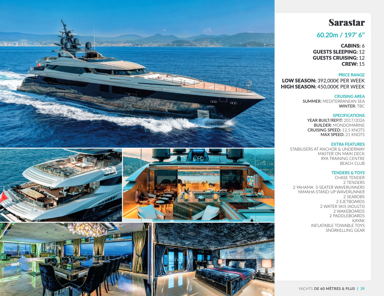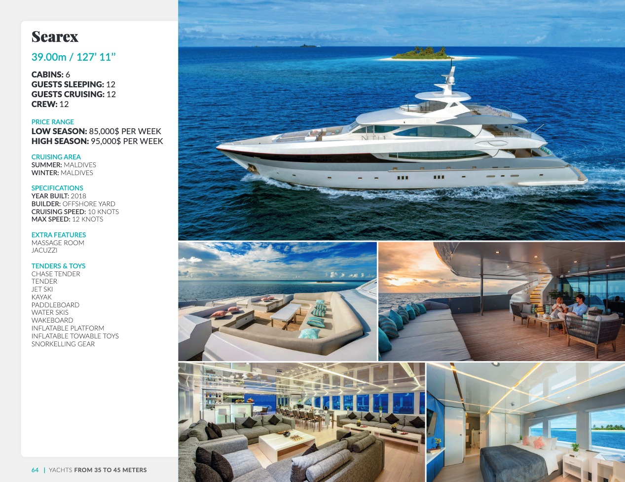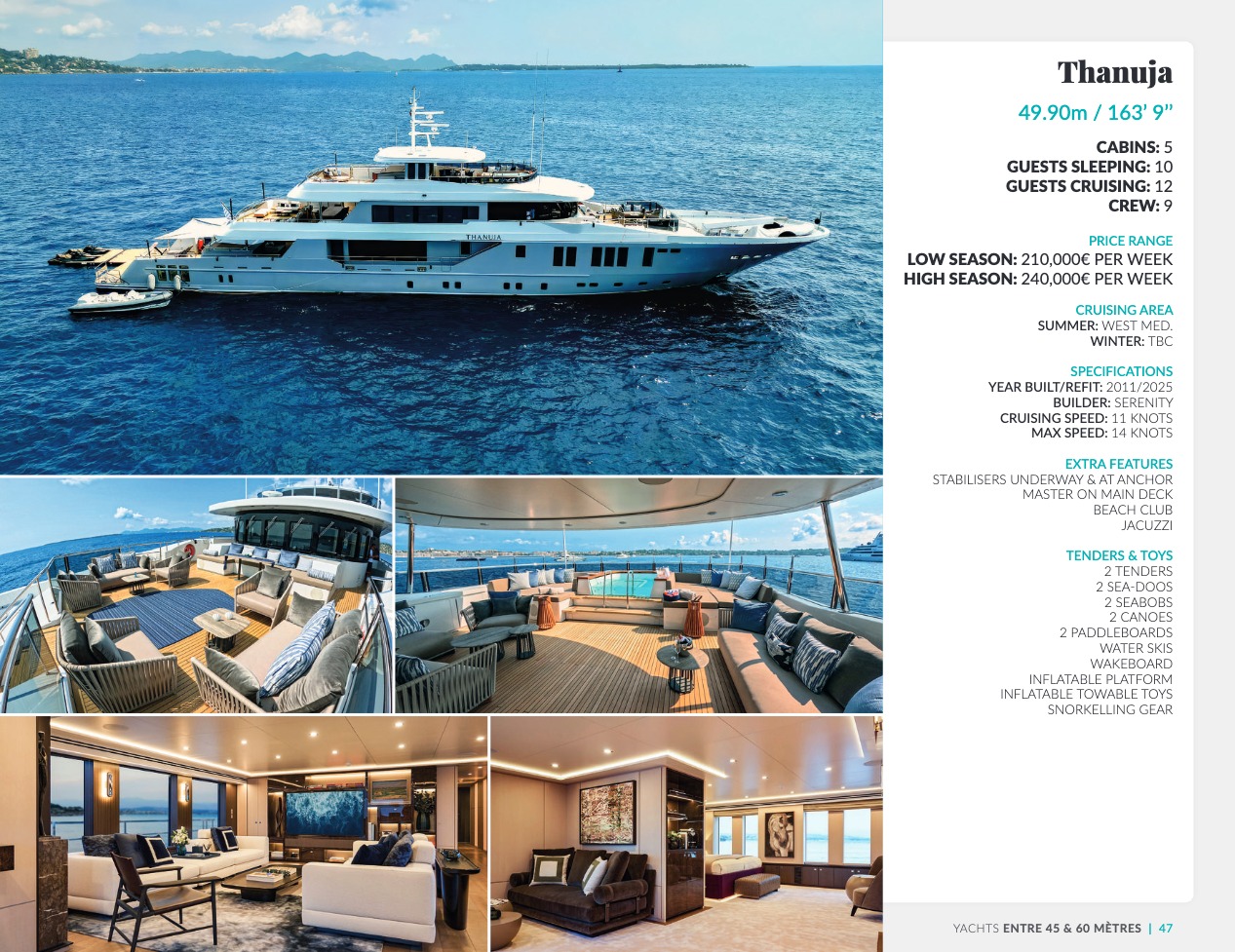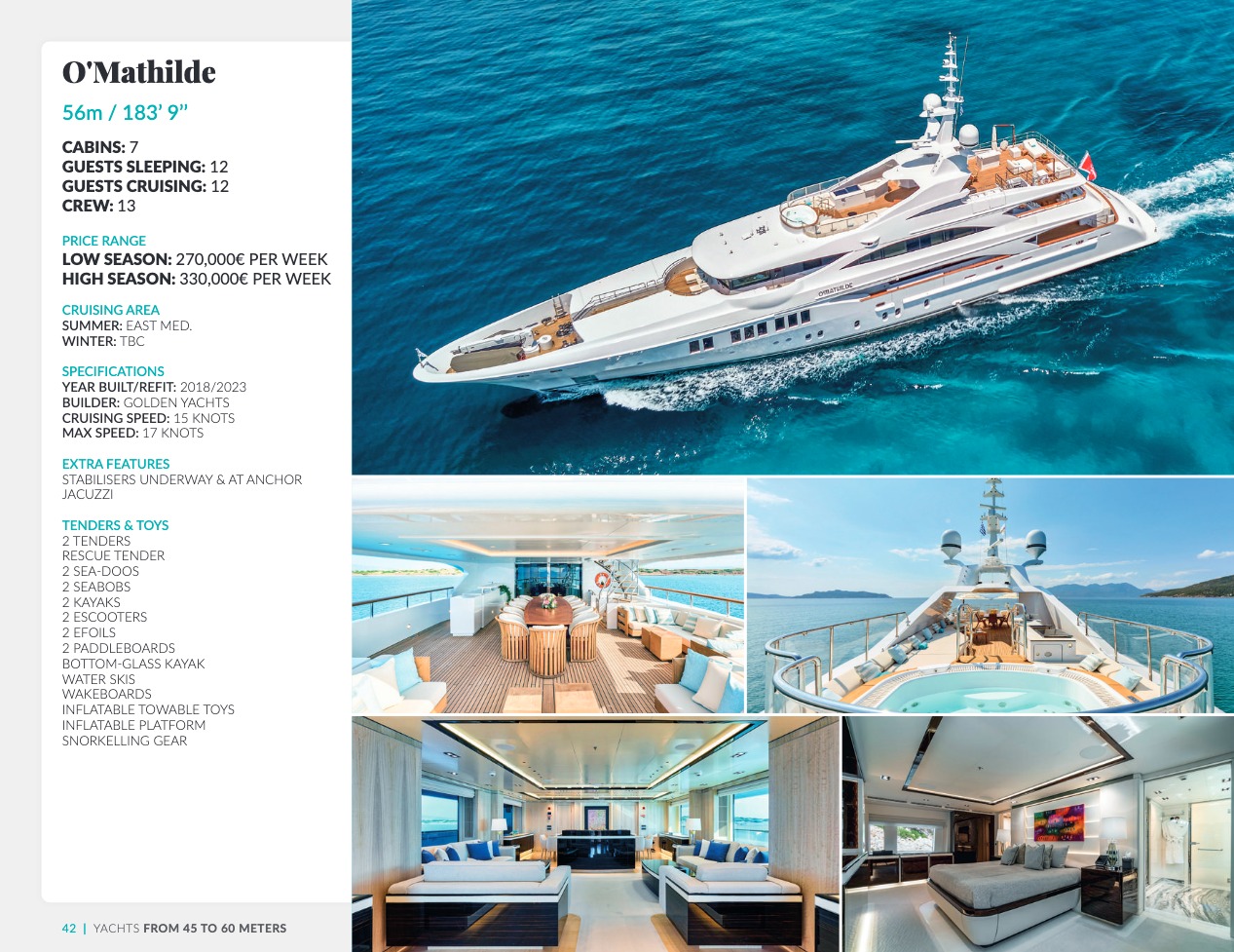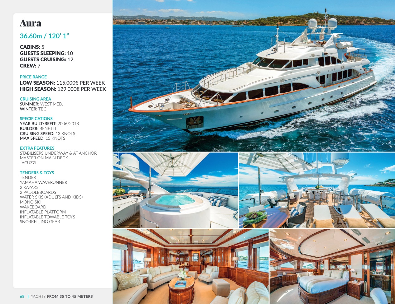 Ce qui distingue le yacht de luxe entre tous est le caractère d’exception des prestations et du bien-être paradisiaque qu’il offre. Avec une recherche de qualité, d’innovation et d’esthétique qui se retrouvent dans chaque détail, vous bénéficierez d’une expérience hors du commun, et ce, que vous ayez choisi pour des séjours de courte durée, ou pour en profiter à votre guise toute l’année. Design, technologie, puissance de navigation, agencement et décoration intérieur haut de gamme transforment ces navires en paradis voguant sur les eaux de toute la planète. Le yacht de luxe peut être un élégant voilier basé en Méditerranée tel que Rosehearty, un catamaran comme Hémisphère sillonnant le pacifique Sud ou un superyacht à l’image de Bella Vita du chantier Benetti. Le séjour s’y présente en aventure inoubliable, riche d’un confort immense, avec piscine, spa, sauna, suites de luxe, salle de réception.