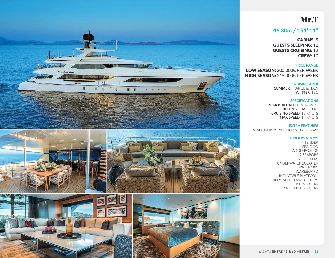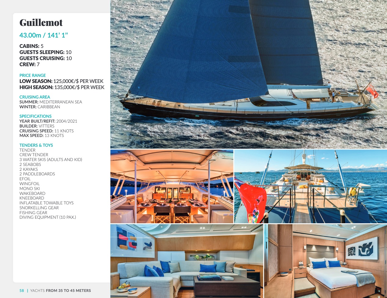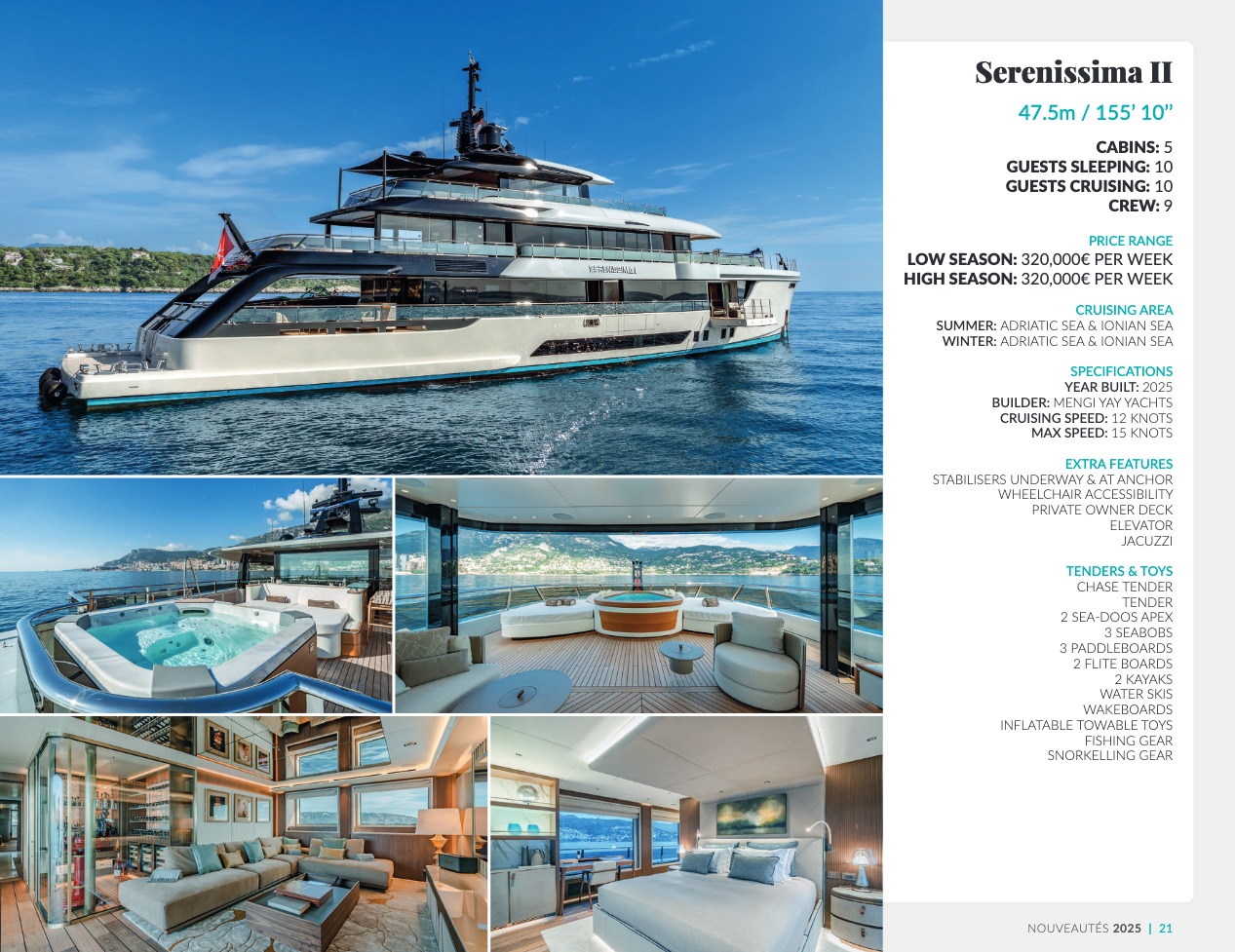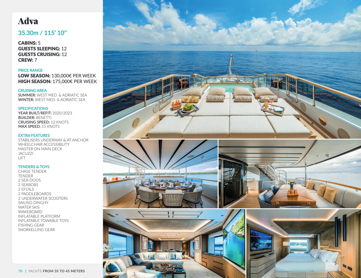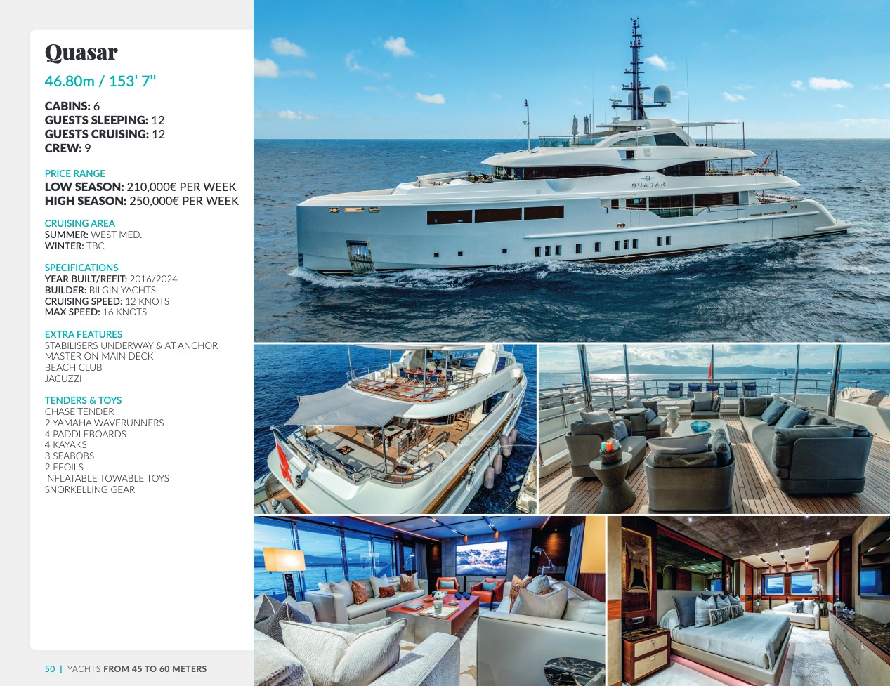 Ce qui distingue le yacht de luxe entre tous est le caractère d’exception des prestations et du bien-être paradisiaque qu’il offre. Avec une recherche de qualité, d’innovation et d’esthétique qui se retrouvent dans chaque détail, vous bénéficierez d’une expérience hors du commun, et ce, que vous ayez choisi pour des séjours de courte durée, ou pour en profiter à votre guise toute l’année. Design, technologie, puissance de navigation, agencement et décoration intérieur haut de gamme transforment ces navires en paradis voguant sur les eaux de toute la planète. Le yacht de luxe peut être un élégant voilier basé en Méditerranée tel que Rosehearty, un catamaran comme Hémisphère sillonnant le pacifique Sud ou un superyacht à l’image de Bella Vita du chantier Benetti. Le séjour s’y présente en aventure inoubliable, riche d’un confort immense, avec piscine, spa, sauna, suites de luxe, salle de réception.