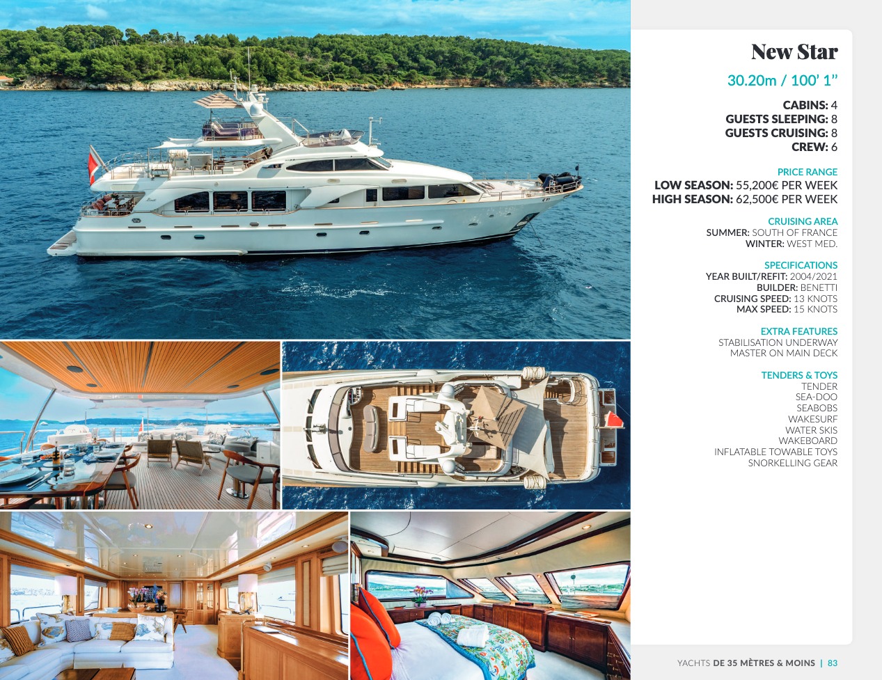 Nous vous accompagnons pour identifier avec vous le yacht de luxe qui correspond à votre niveau d’exigence. Chaque bâtiment à son âme particulière, avec une atmosphère et un style de vie qui lui sont propre. Forts d’une connaissance pointue des différents navires de plaisance, de leurs équipages et de leurs spécificités, nos brokers devancent vos attentes avec des propositions optimales. Selon votre projet, achat ou location, utilisation privée ou professionnelle, destinations souhaitées, ils vous assistent pour sélectionner le yacht de luxe le plus adapté : en taille, capacité d’accueil, degré d’équipement des cabines et du pont, en design intérieur et extérieur, et bien entendu en puissance de motorisation. Pour la réservation ponctuelle comme pour l’achat, vous bénéficierez de notre expertise de la négociation jusqu’aux formalités.