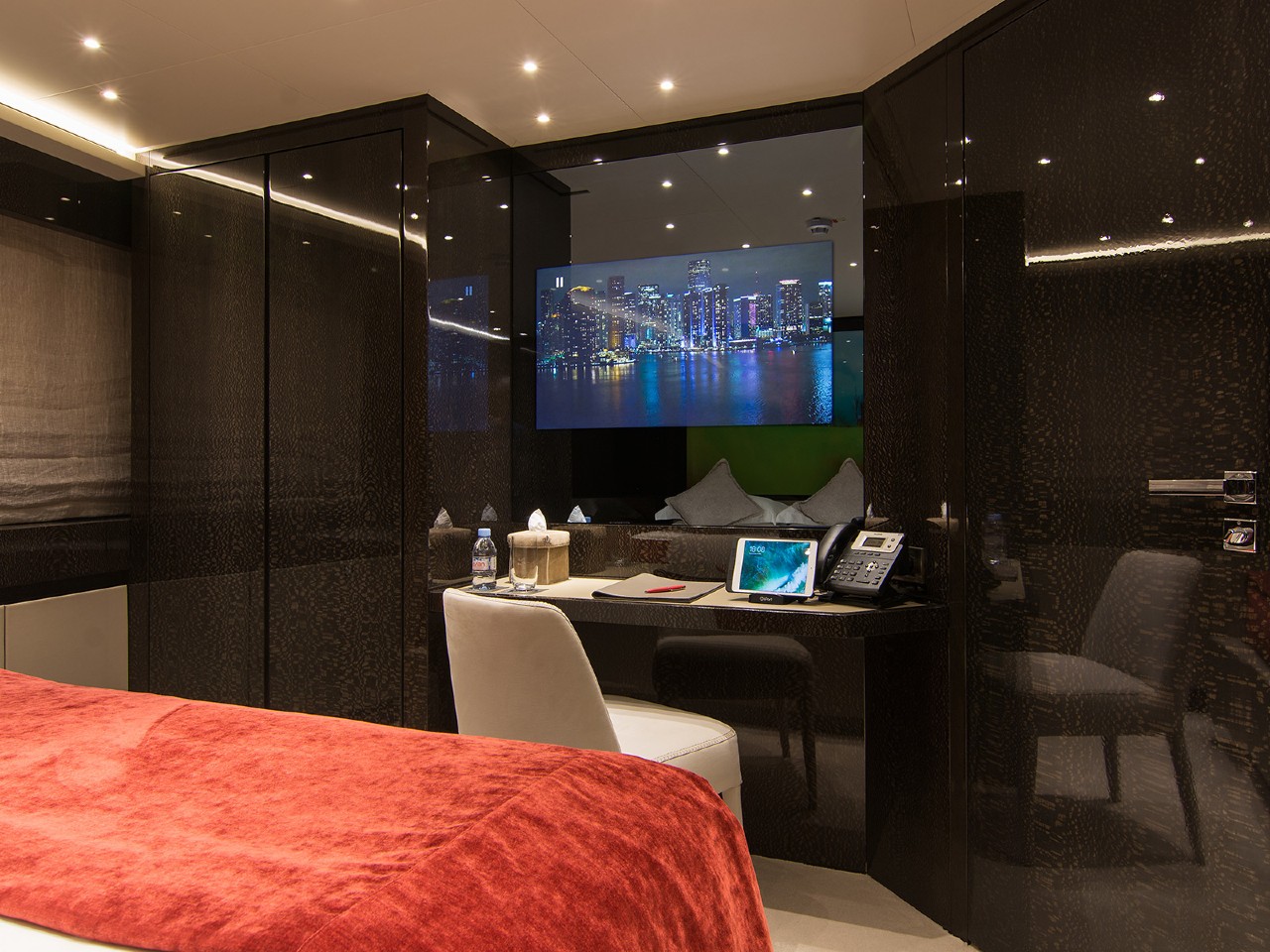 Onboard amenities include a deck jacuzzi, perfect for soaking up the sun and taking in the stunning views, as well as satellite communications and Wi-Fi connectivity to keep you connected while at sea. The yacht also features air conditioning throughout for your comfort, and an array of water-toys including Jet Skis, waterskis, wakeboards, inflatable water toys, kneeboards, paddleboards and snorkelling equipment for endless fun on the water.