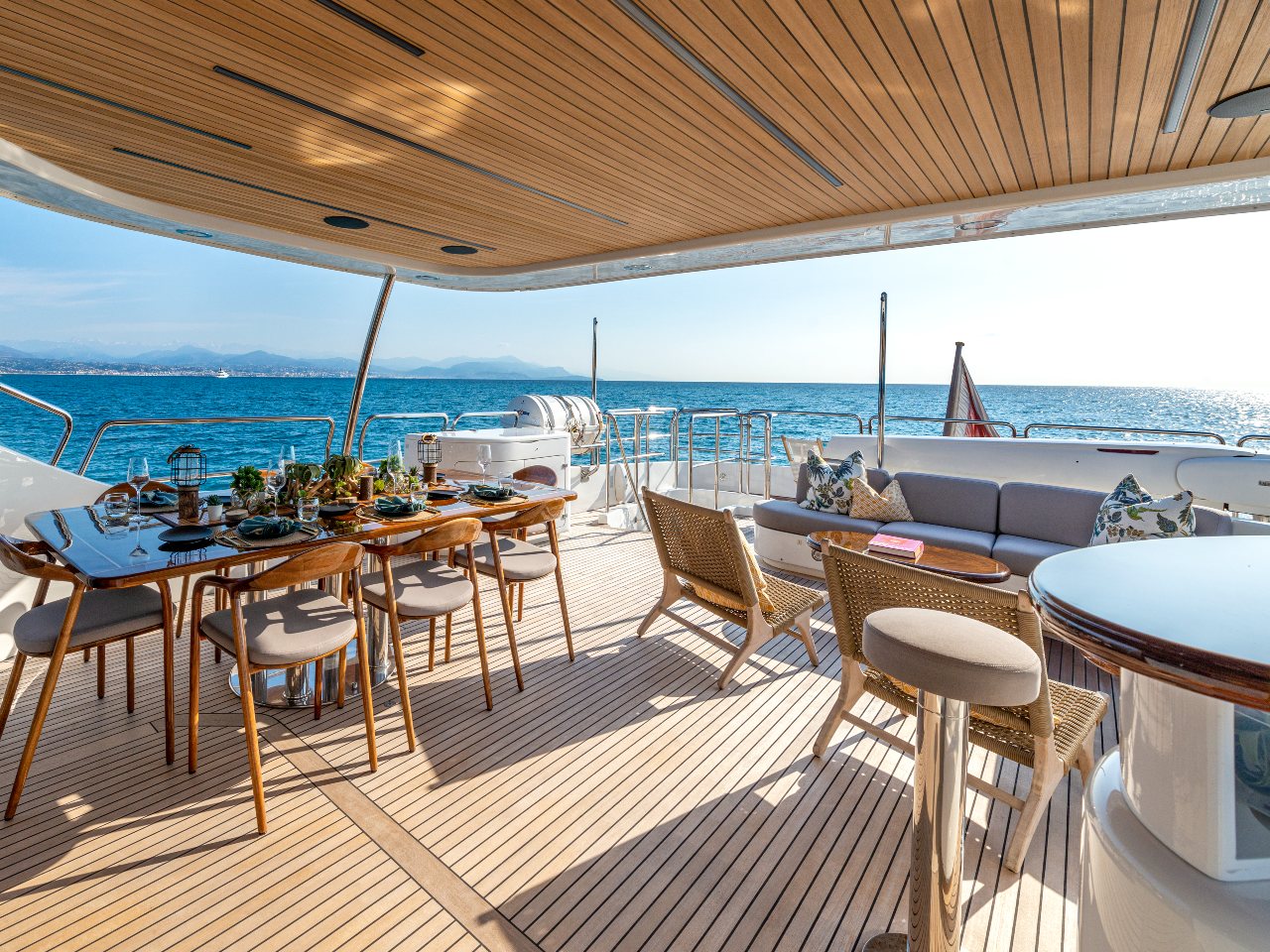There are large deck spaces and it is possible to sit outside at night and enjoy films or TV on a new 65” cinema. Al fresco dining is available on the main deck and the upper deck where you can also find a covered bar area.
