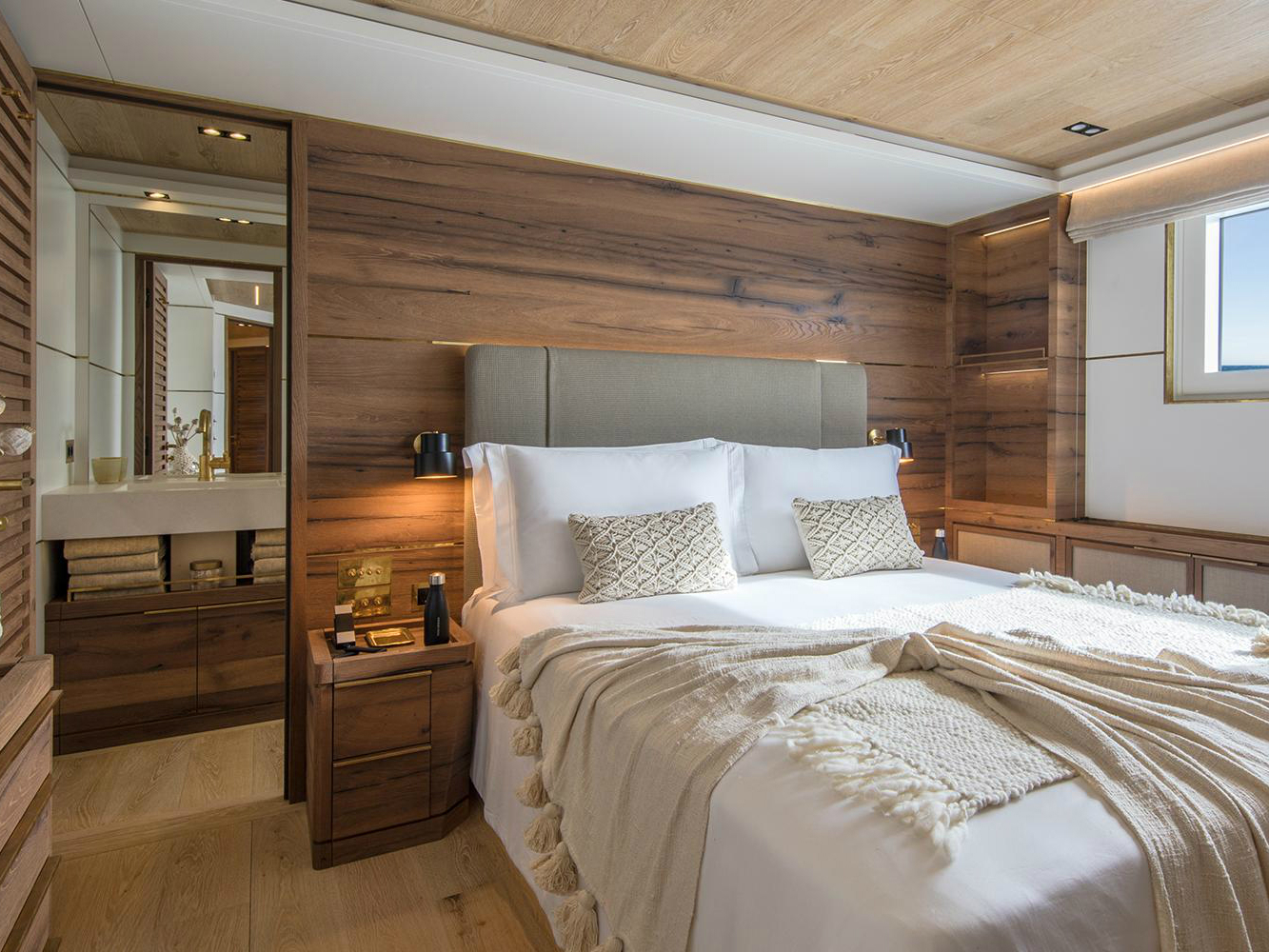 Réparti sur trois ponts, auxquels s’ajoute un sublime sun deck “club space” aux volumes exceptionnels et aux aménagements soigneusement dessinés, SABAI peut accueillir jusqu’à 10 invités, pris en charge par un équipage expérimenté de six membres. Le salon principal est dédié à une expérience de vie intérieur/extérieur, tandis que le sky lounge supérieur offre un espace barbecue et bar, ainsi qu’une élégante salle à manger, dont la magnifique table occupe la place d’honneur.