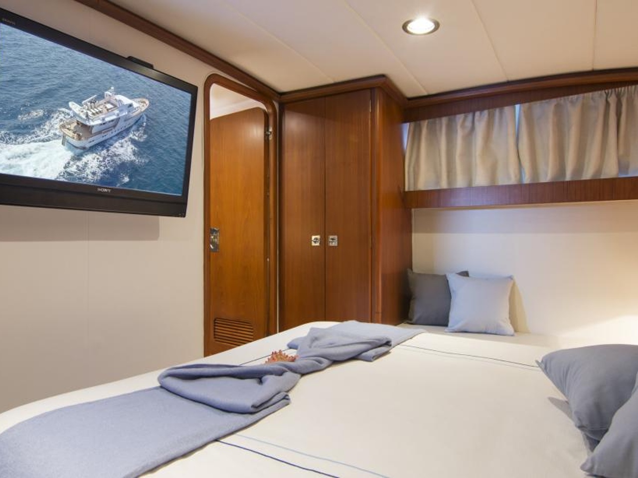 La cabine principale est située sur le pont principal et comprend un lit double ainsi qu'un canapé-lit en option pouvant accueillir un enfant. Une cabine VIP avec un lit double, un canapé-lit, ainsi que deux cabines d'invités avec lits jumeaux et deux lits Pullman se trouvent sur le pont inférieur. OCEANE II offre de nombreux espaces de vie extérieurs pour profiter avec élégance ; un flybridge supérieur est parfait pour se divertir et se détendre, offrant une option idéale pour les repas en plein air et deux bains de soleil. Sur le pont avant, un espace de détente confortable et une banquette à l'avant sont parfaits pour un moment de tranquillité.